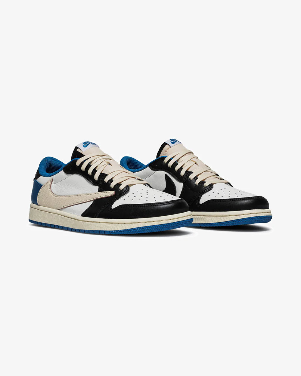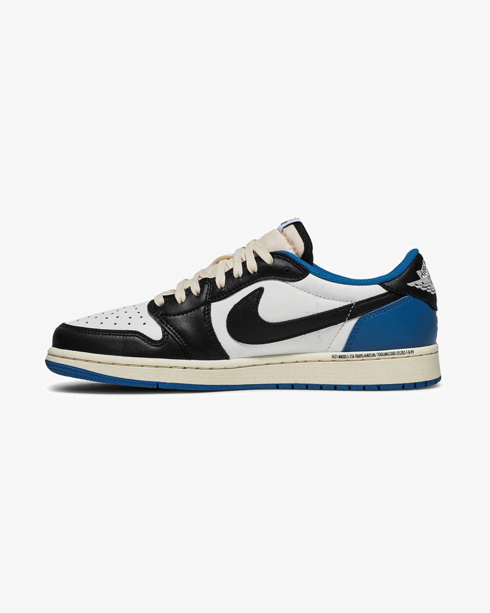 A legendary collab between Travis Scott, Fragment Design, and Jordan Brand. This Air Jordan 1 Low OG features premium leather, a reverse Swoosh in sail, black overlays, and bold royal blue accents. A highly coveted release that blends streetwear style with collectible status.